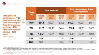 - Por otra parte, para el mes de marzo de 2021, la tasa de desempleo fue 14,2 % en el total nacional. En 13 ciudades y áreas metropolitanas fue de 16,8 %.